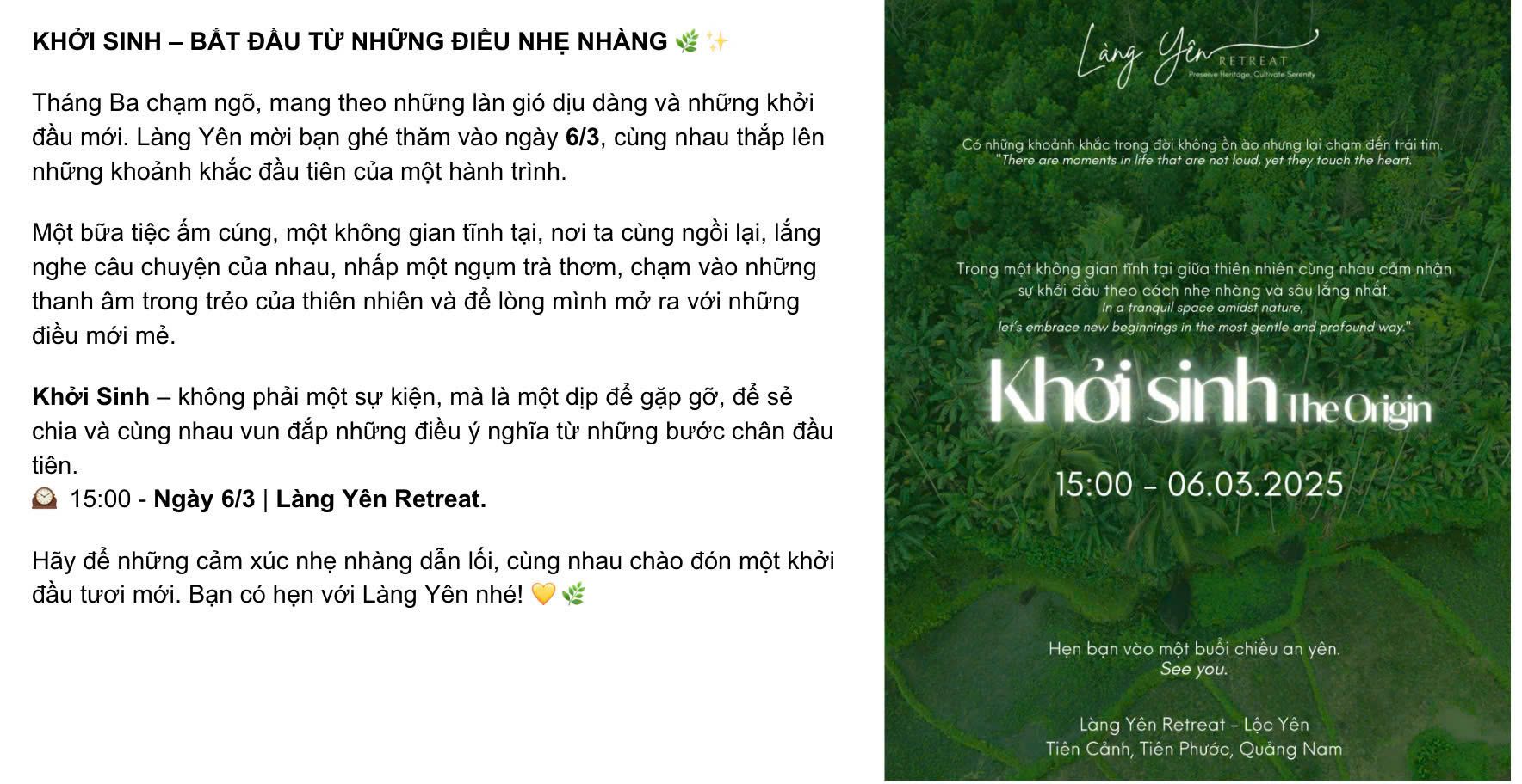 Lộc Yên, ngày 06 tháng 03 năm 2025 – Vào lúc 15h ngày 06/03/2025, Làng Yên Retreat chính thức mở ra một chặng đường mới với sự kiện Khởi sinh, một buổi gặp gỡ thân mật đánh dấu sự khởi đầu của không gian nghỉ dưỡng, thiền định và kết nối thiên nhiên giữa lòng Lộc Yên cổ kính.