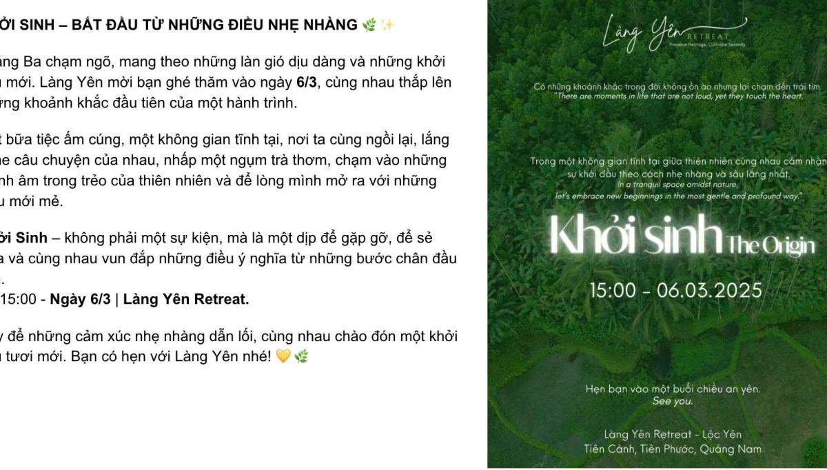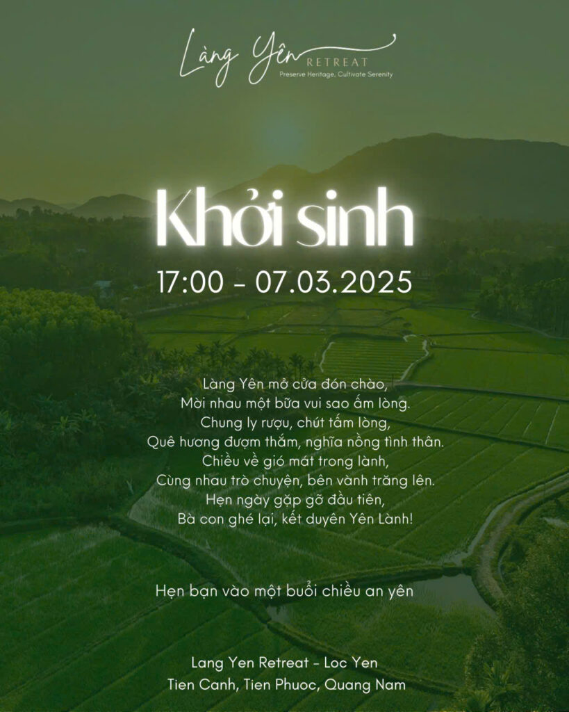 Với mong muốn tạo nên một không gian an yên, gần gũi với thiên nhiên và cộng đồng, sự kiện Khởi sinh diễn ra trong không khí ấm áp và chân thành. Đây không chỉ là dịp để chia sẻ về hành trình hình thành Làng Yên Retreat mà còn là cơ hội để những người yêu thiên nhiên, văn hóa và nghệ thuật cùng gặp gỡ, kết nối.